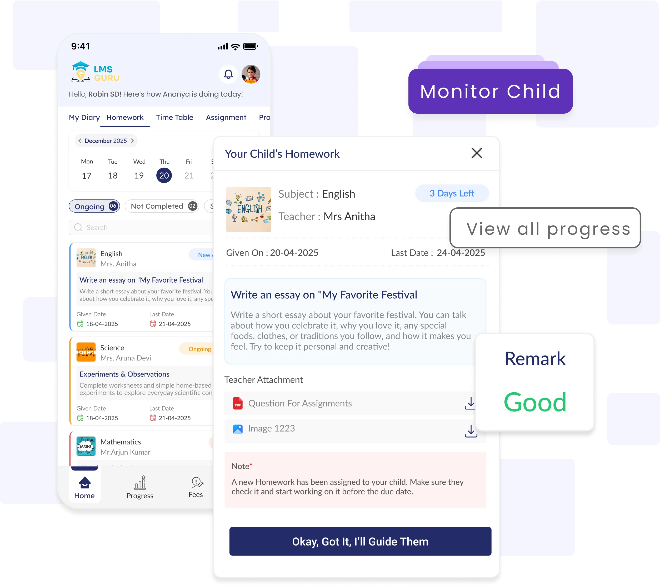 Enable parents to easily track homework completion, teacher remarks, and grading—promoting active involvement and academic awareness.