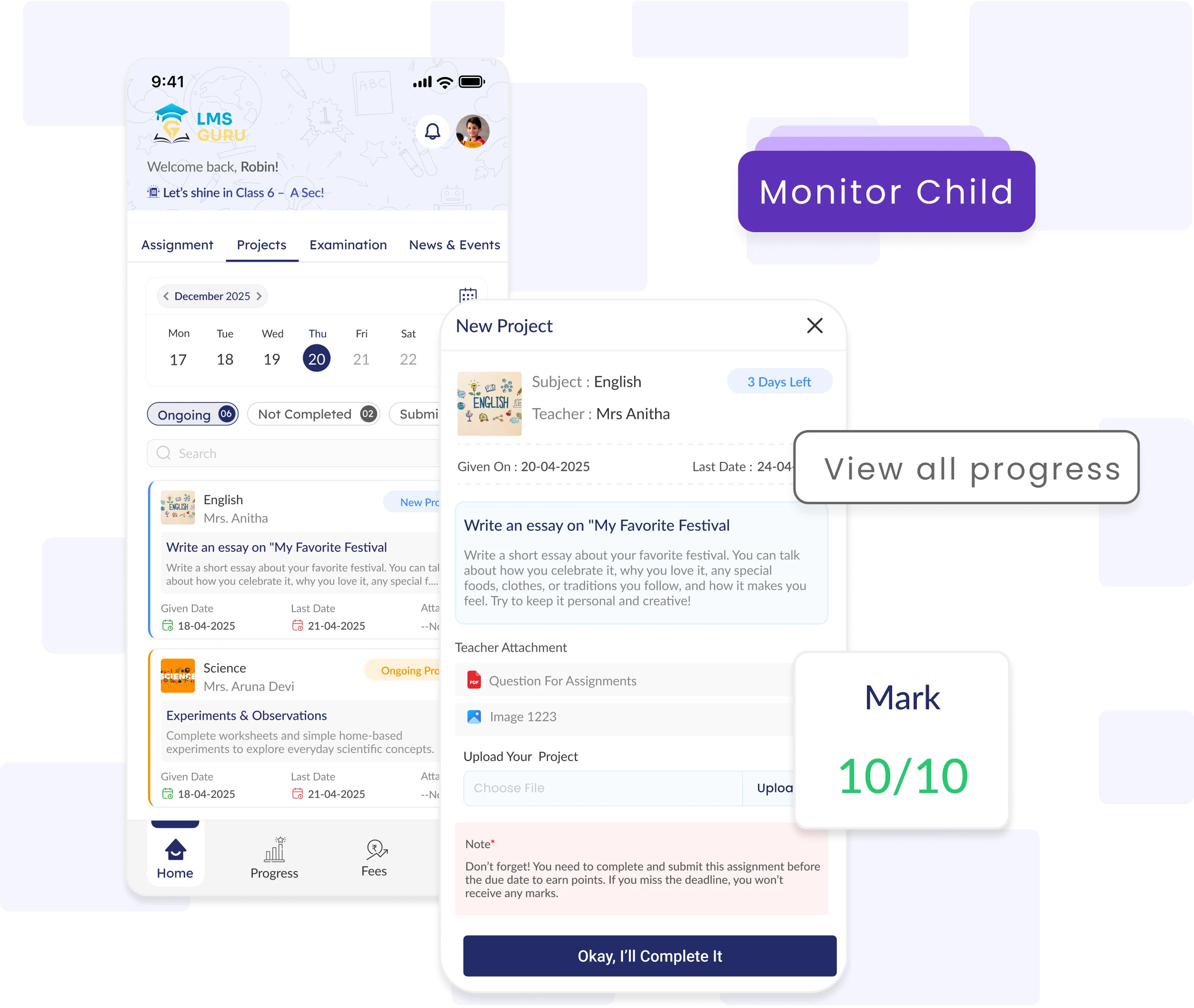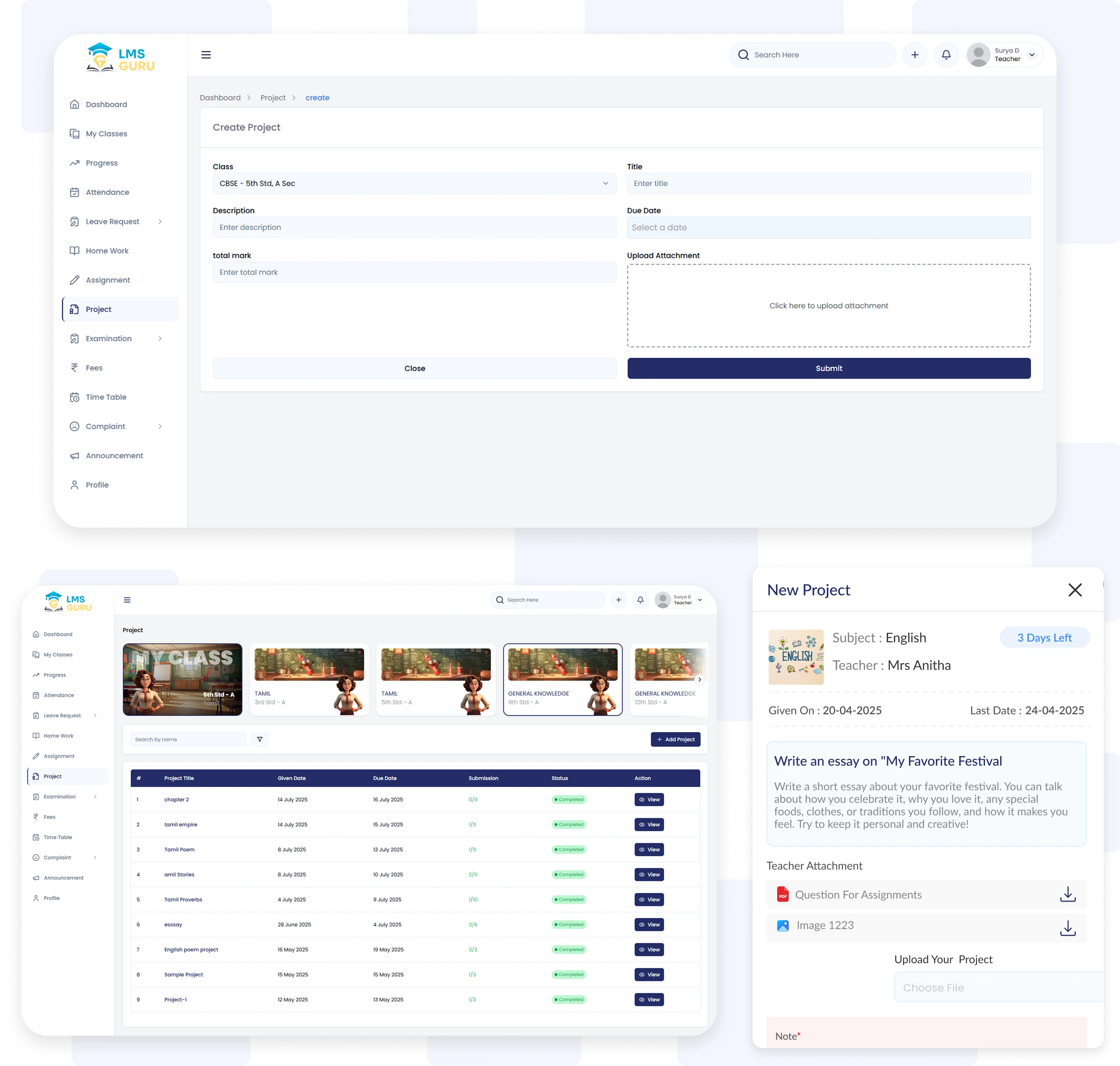 Assign, submit, review, and grade projects in one place—empowering teachers, students, and parents with clear visibility and structured academic engagement.